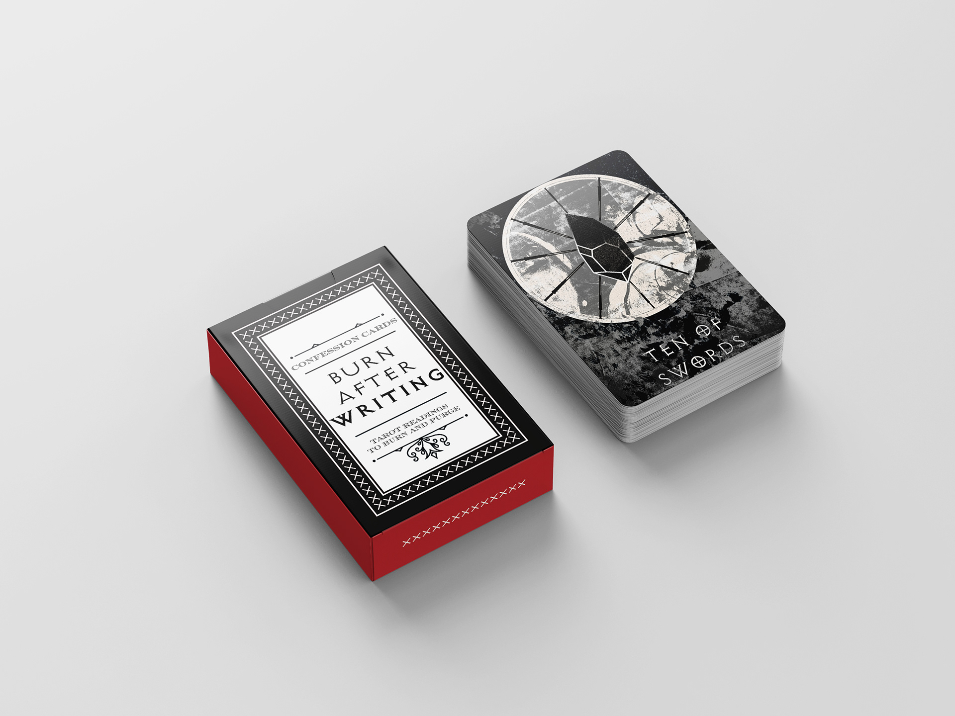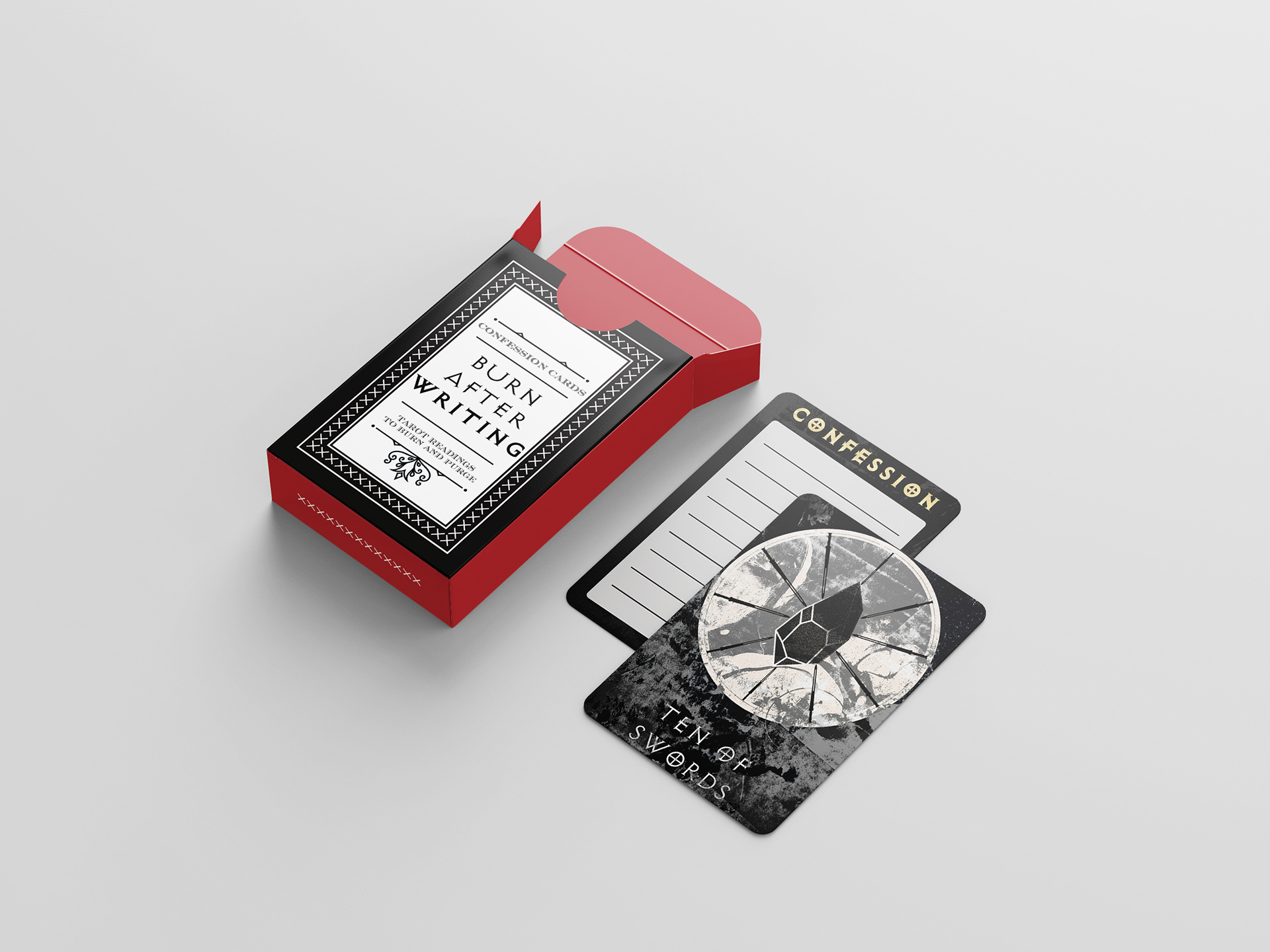 Tarot cards, made solely for writing confessions on, where these confessions can either be stowed away and forgotten, or to be physically burned/purged permanently.